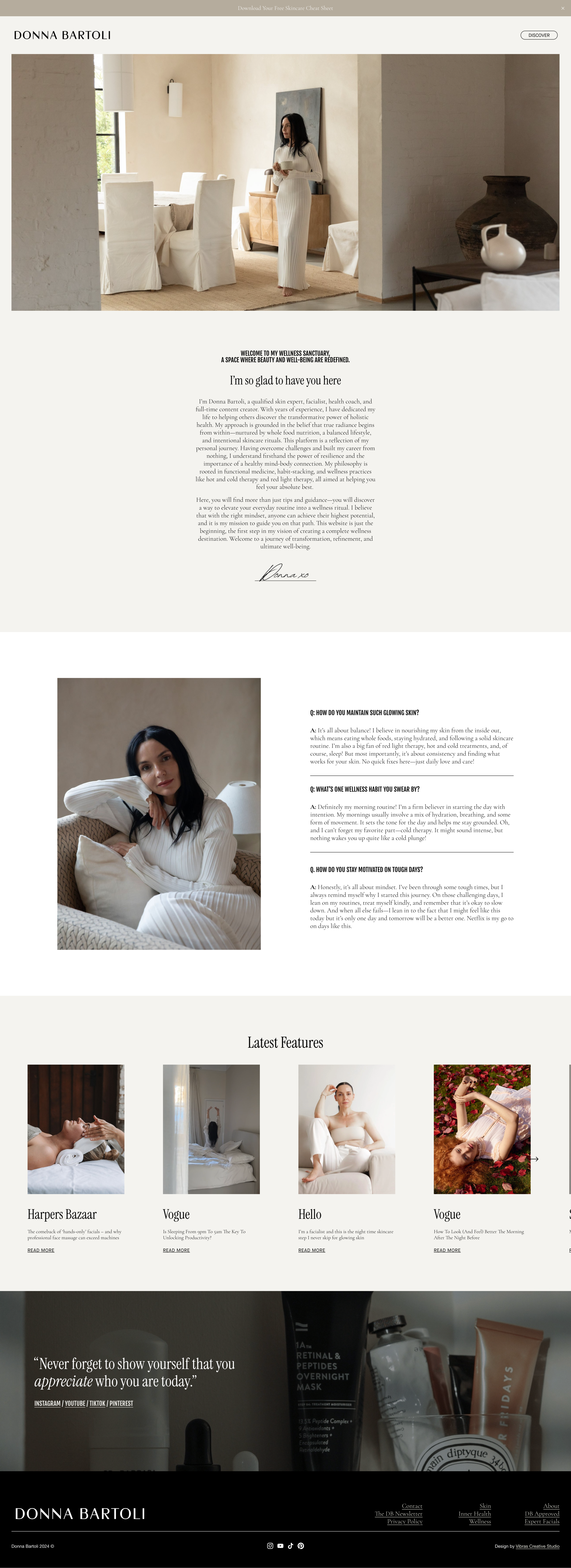 A/W 2024BRIGHTON, ukAbout the projectDonna Bartoli is a qualified skin expert, facialist, health coach and full-time content creator. The brief was to create an online sanctuary for Donna’s community, where they could begin a journey of transformation, refinement and well-being. This rebrand helped Donna bring a long-term vision to life, by creating the ultimate destination for her signature approach to skin health and anti-inflammatory living.